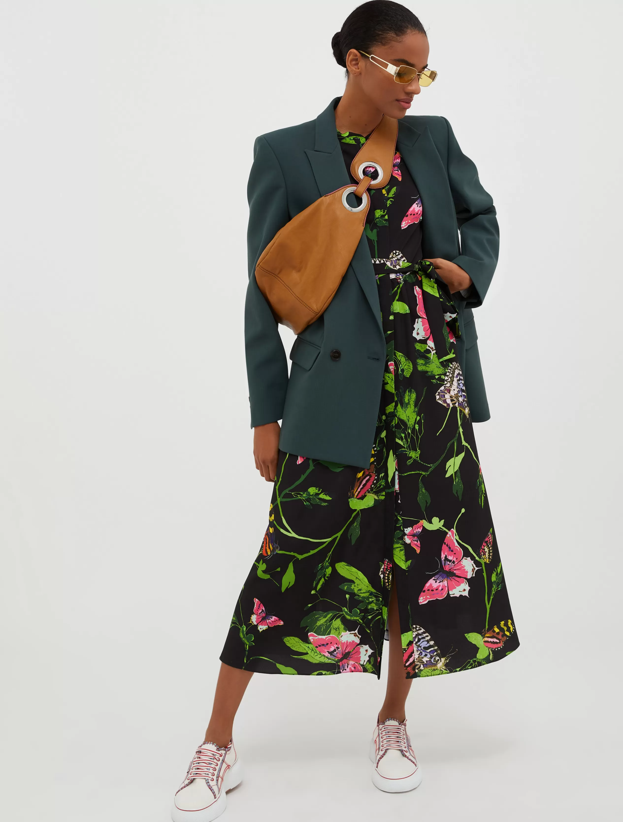 Chemisier midi in crêpe de Chine con collo alla coreana, maniche trequarti con volant asimmetrici, con cintura coordinata e gonna svasata con spacchi laterali. Bottoni nascosti e tasche inserite, sfoderato