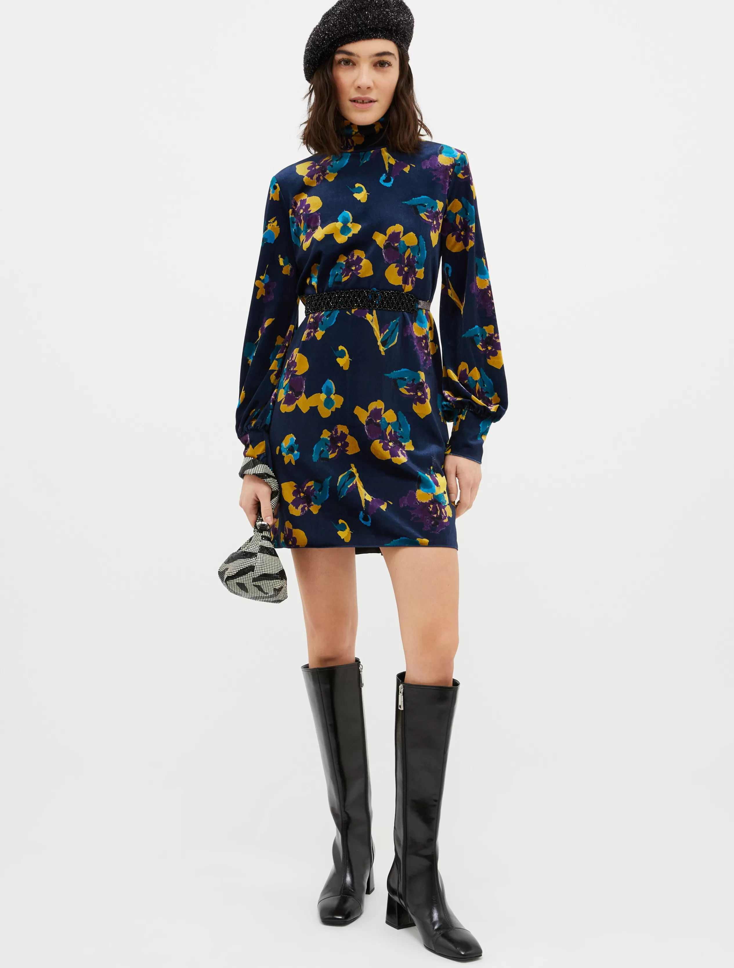 Abito in jersey velluto floral tapestry. Taglio a tunica diritto e morbido, ha il collo a lupetto e i polsi leggermente a sbuffo. Mood romantico, è perfetto di giorno con lo stivale basso, e di sera con i tacchi.