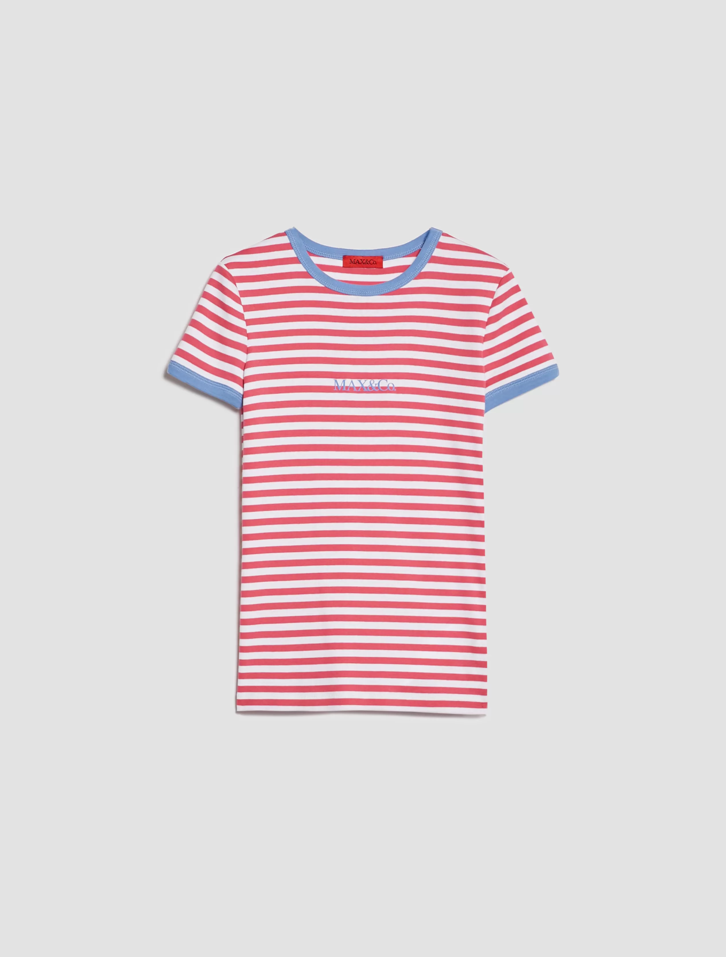 Nuove varianti a righe marinière e a fantasia maculata per la T-shirt best seller con il logo MAX&Co. a effetto 3D sul davanti. In jersey di cotone, ha un taglio slim ed è rifinita con bordi a contrasto. Con i jeans o il suit, sempre perfetta.